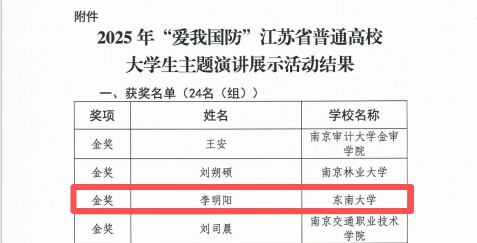 2026年1月7日,以“弘扬抗战精神 共筑国防长城”为主题的2025年“爱我国防”江苏省普通高校大学生主题演讲展示活动在新华报业传媒集团大礼堂顺利举行。永利app 24级硕士研究生李明阳的作品《平凡的坚守》斩获金奖(全省共四项),学院杨帆老师作为指导老师之一,荣获优秀指导教师。