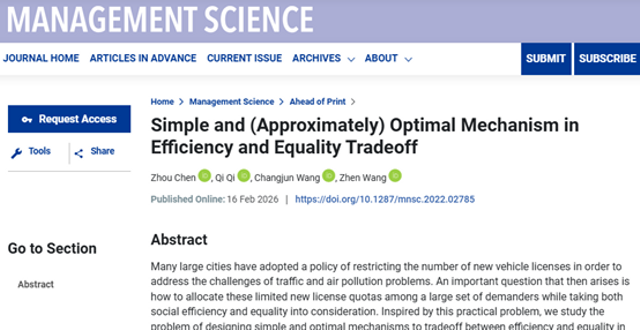 日前,永利app-永利平台 陈洲老师合作完成的论文在管理学顶级期刊《Management Science》在线发表。该论文聚焦稀缺公共资源怎么分配既公平又高效的现实难题,提出一种“先拍卖后抽签”的混合分配机制。陈洲老师为该论文第一作者。