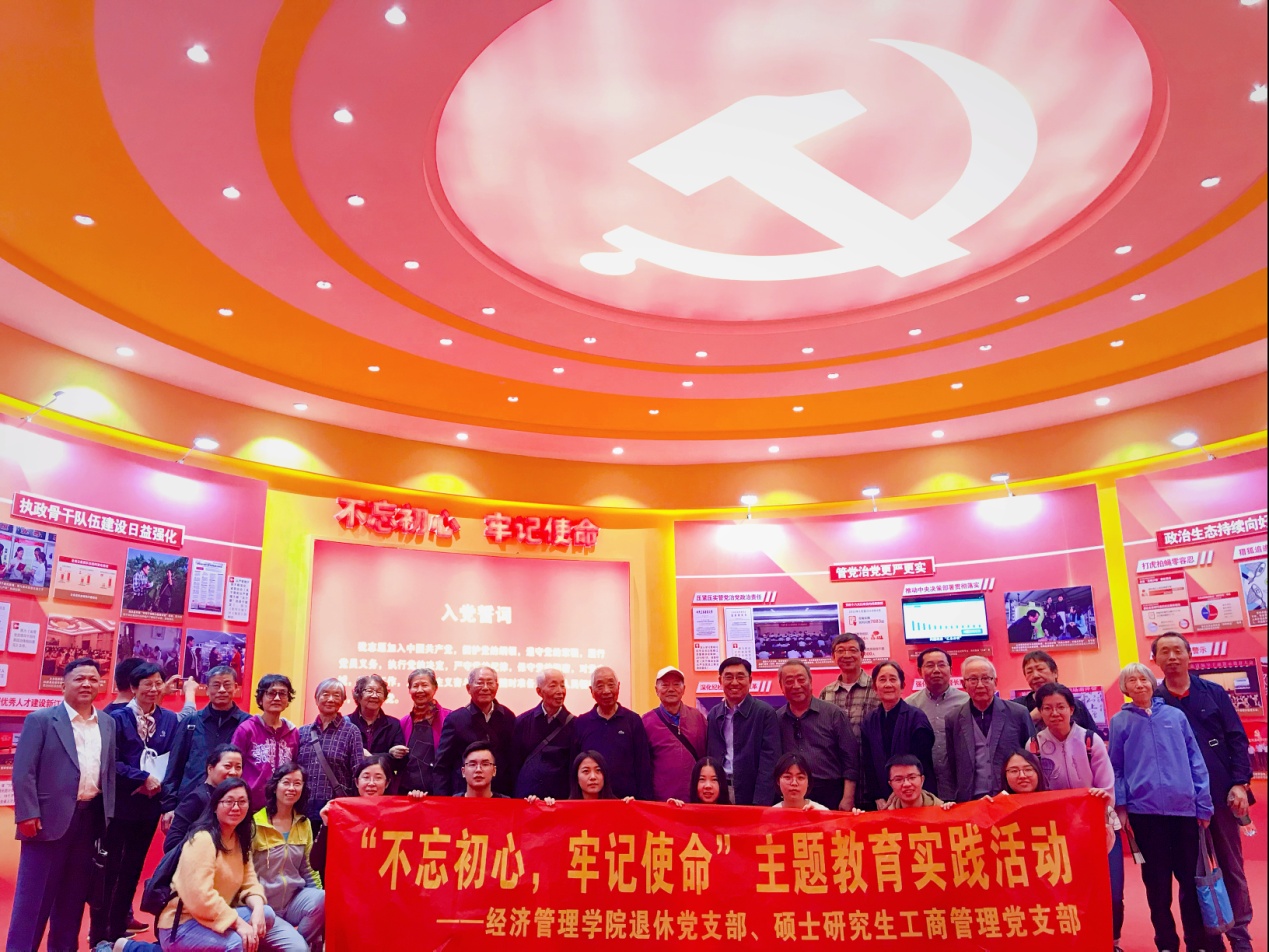 2019年10月24日,学院党委组织开展“不忘初心、牢记使命”主题教育实践活动,师生支部共建,参观“江苏省庆祝中华人民共和国成立70周年成就展”。仲伟俊等学院党政领导、教职工党支部书记、退休党支部和硕士研究生工商管理党支部成员一行45人参加了活动。