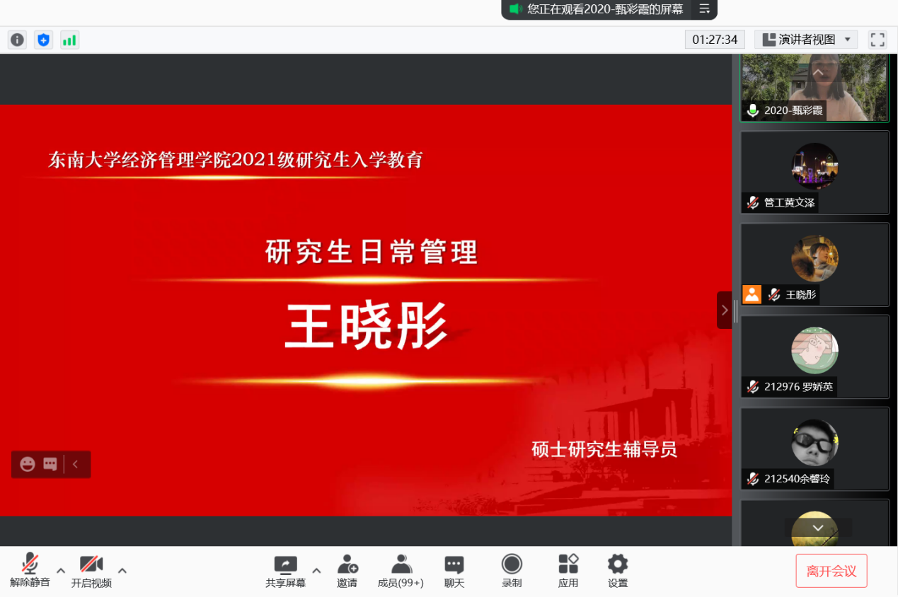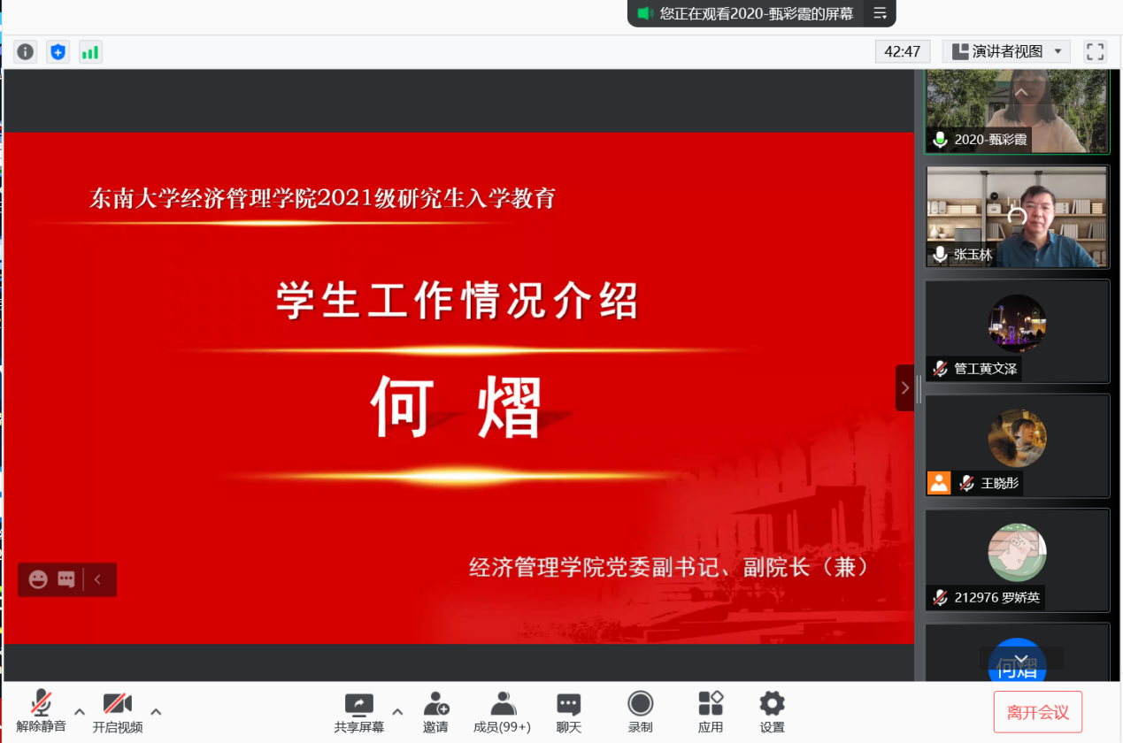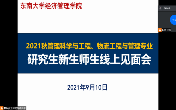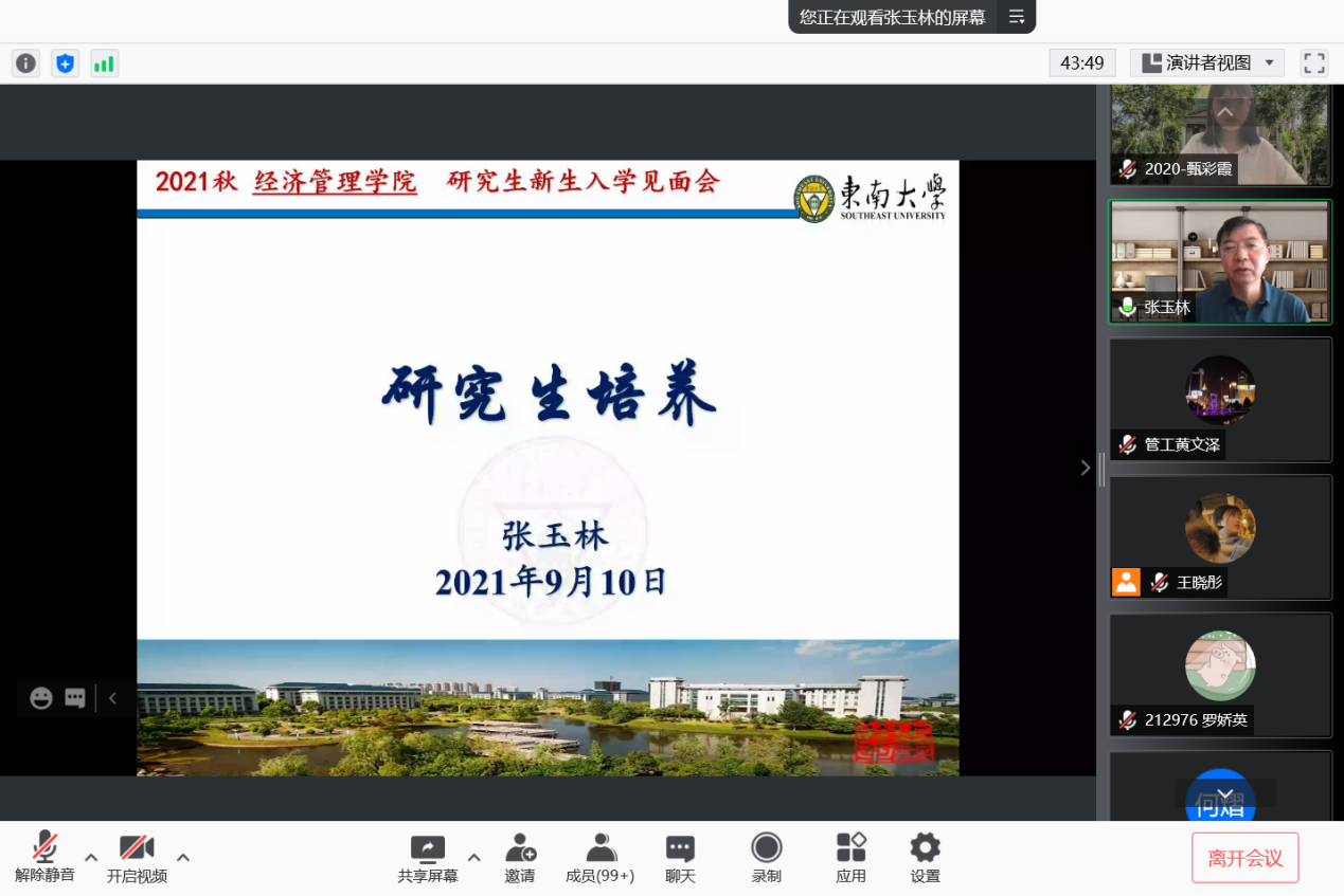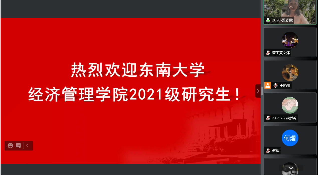 2021年9月10日上午9时,恰逢教师节,永利app-永利平台 研究生新生入学教育如期举行,2021级182位硕士研究生及17位秋季入学的博士研究生在云端与东大经管相约。