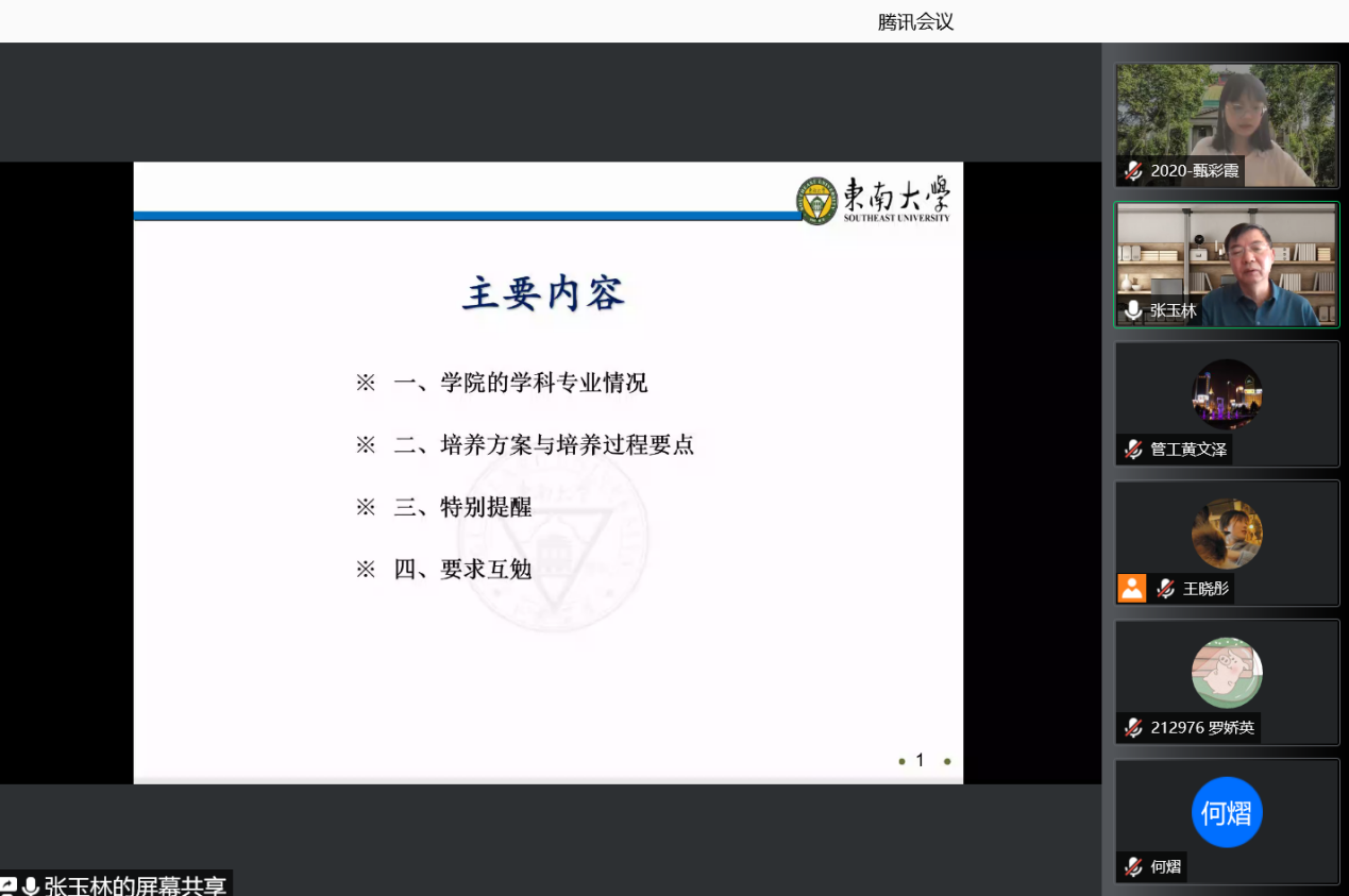 因疫情防控要求,本次会议全程采取线上方式。出席本次入学教育的领导嘉宾有:永利app 党委副书记兼副院长何熠老师,永利app 副院长、博士生导师张玉林老师,研究生教务助理杨悦老师、研究生辅导员王晓彤、孙靓、陈丰龙、史雅妮、郑凯戎老师。入学教育由2020级硕士研究生甄彩霞同学主持。