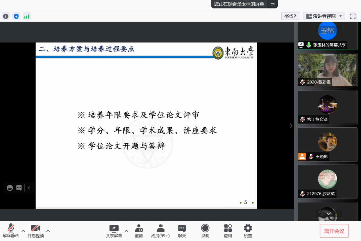 会议最后,硕士研究生新生辅导员王晓彤老师带来研究生日常管理相关工作的介绍。王老师首先通过新生大数据,让大家了解自己所在的新生群体,提升集体荣誉感和使命感。其后,王老师将同学们未来学习生活中的办事流程、学办职能、信息获取方式、党团组织、日常管理等问题一一进行介绍,并提出研究生的科研学习是一项艰巨但充满能量的过程,要敢于面对困难,多和导师、辅导员、课题组同学沟通,要一直相信东大永远是你坚强的后盾。王老师的一席话让同学们对新的生活有了更多的憧憬。
